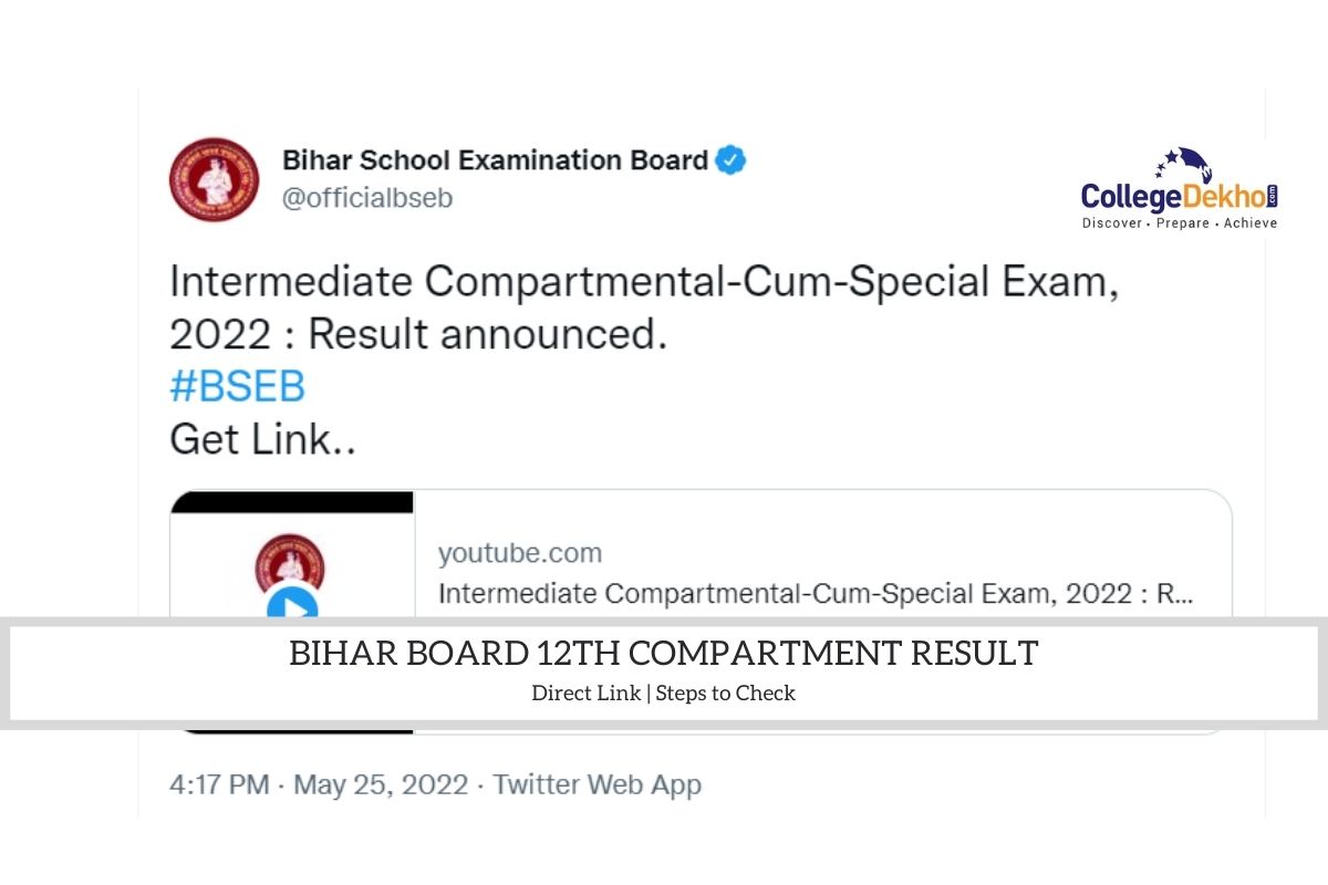 Bihar Board (BSEB) 12th Compartment Resulthas been announced at results.biharboardonline.com onMay 25, 2022. Candidates may check their results using their Roll Code and Roll Number. The result declaration announcement was made on Twitter through the official handle of BSEB after which the link on various websites has been activated.