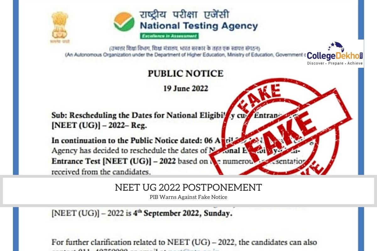 NEET UG 2022 Postponement Notice has been seen circulating in media and PIB Fact Checker has now warned students against it as the notice is FAKE. For now, NEET UG 2022 will be held as scheduled on July 17.