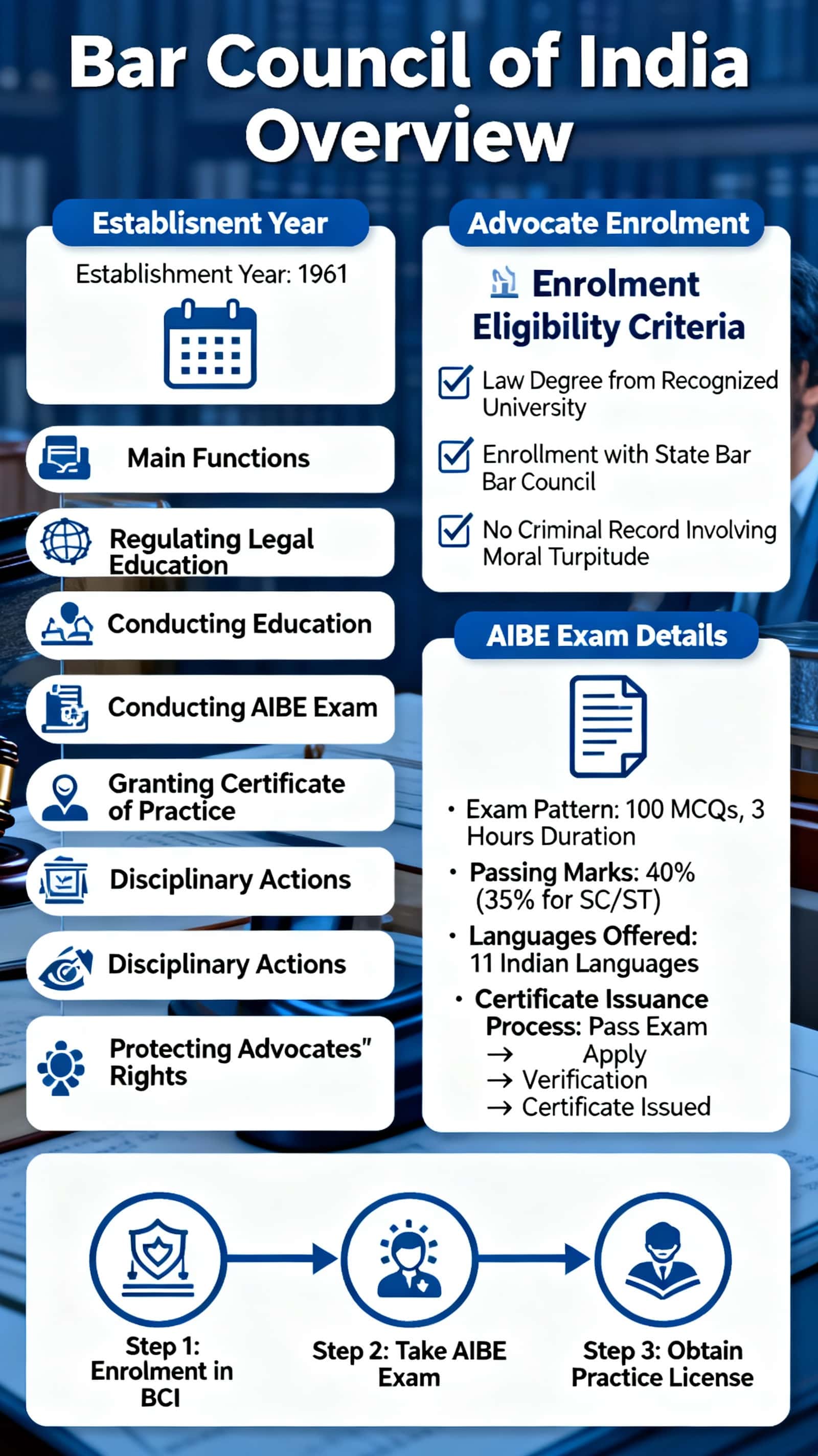 The All India Bar Examination, or AIBE, is conducted for granting the 'Certificate of Practice' to all advocates who are eligible to practise law in India. The funds for welfare schemes that are created for the economically weaker and the physically handicapped advocates are also provided by the BCI. It also performs particular representative functions by protecting the privileges, rights, and interests of advocates. It is the duty of the enrolment committee of BCI to verify the application forms of the candidates and they are given a 'Certificate of Enrolment'. The Bar Council of India consists of members who are chosen from the law fraternity of the country.