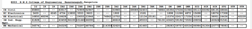 The table below contains the BMS College of Engineering GM Category Round 2 KCET Cutoff for 2024, 2023 and 2022.Name of the Course | 2024 | 2023 | 2022 |