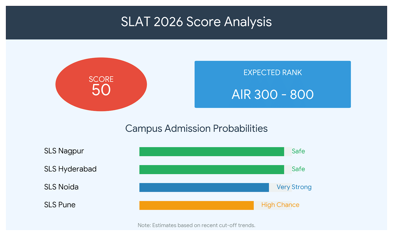 For projecting SLAT 2026 ranks, it is reasonable to assume a similar difficulty level and candidate volume to 2024 and 2025 unless the pattern changes significantly. A score of 50 marks lies at or slightly above the reported “good score” zone (45–50) and above the expected cut‑off ranges of all four campuses, including SLS Pune, in recent trends.