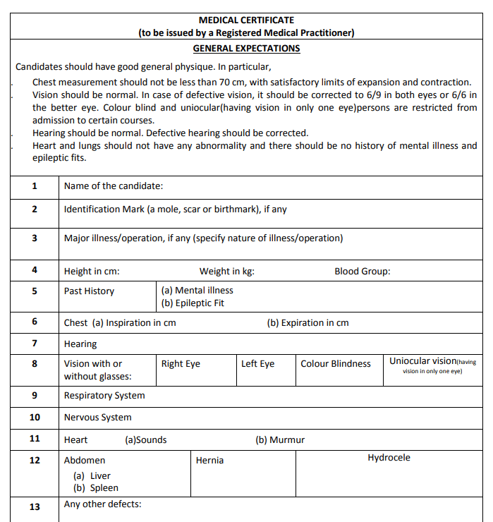 The JoSAA medical certificate has certain sections that should be filled out by the candidates before submitting/uploading the certificate. Check the details mentioned in the JoSAA medical certificate: