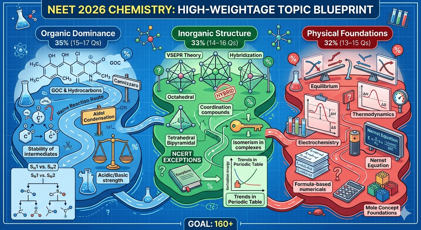To score 160+ in the NEET 2026 chemistry section, you must master GOC, Hydrocarbons, Aldehydes & Ketones in Organic Chemistry. In the case of Inorganic Chemistry, you must prioritise Chemical Bonding, p-Block, and Coordination Compounds. Then, studying Equilibrium, Thermodynamics, Solutions, and Electrochemistry in Physical Chemistry can boost your scoring chances. As the competition intensifies in the NEET 2026 exam chemistry section, scoring 160+ in Chemistry is no longer an advantage, but rather a necessity to get into top government medical colleges. With 50 questions including 5 options, Chemistry serves as the vital scoring bridge between high-yield Biology and challenging Physics.