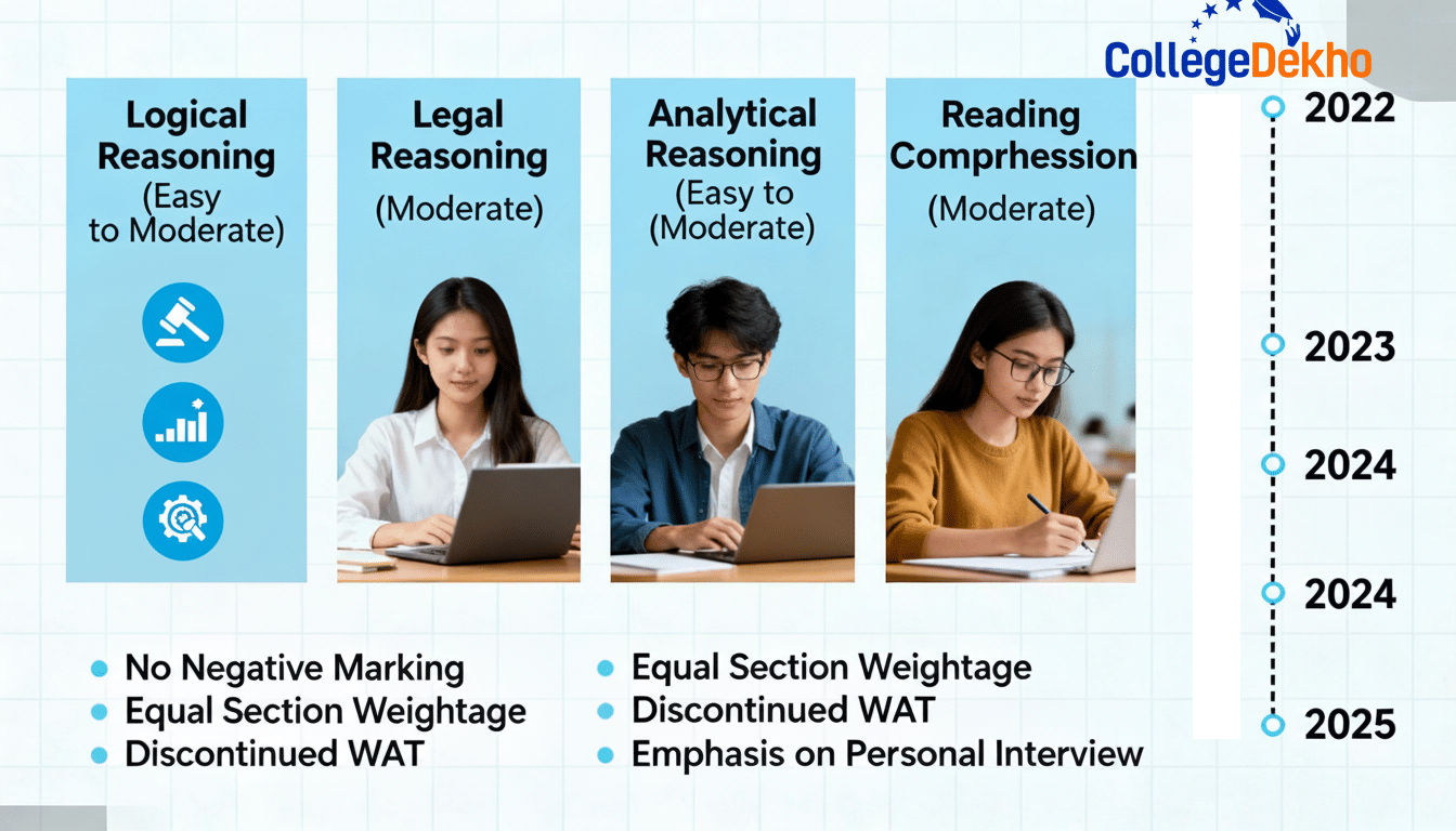 According to the historical analysis of SLAT and the latest changes in exam patterns, the general difficulty of SLAT is expected to remain the same moderate one in 2026. The exam structure is also a computerised test with 60 multiple-choice questions that should be answered in 60 minutes, and the questions are evenly spread across the 5 sections. It is also important to note that the Writing Ability Test (WAT) was also phased out, and the Personal Interview (PI) part of the final selection has become more critical, and the PI performance has been weighted with 30%. Check some additional points to keep in mind for SLAT 2026: