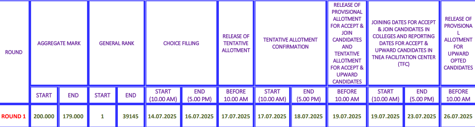 TNEA Round 1 Counselling Dates 2025 will be announced later by DTE, Tamil Nadu. Once the official dates are released, we will be providing the complete TNEA round 1 counselling schedule in the table below: