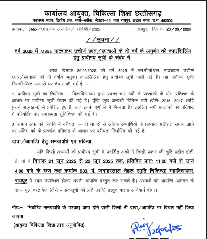 छत्तीसगढ़ मेरिट लिस्ट 2025, 20 जून 2025 को जारी कर दी गयी है।