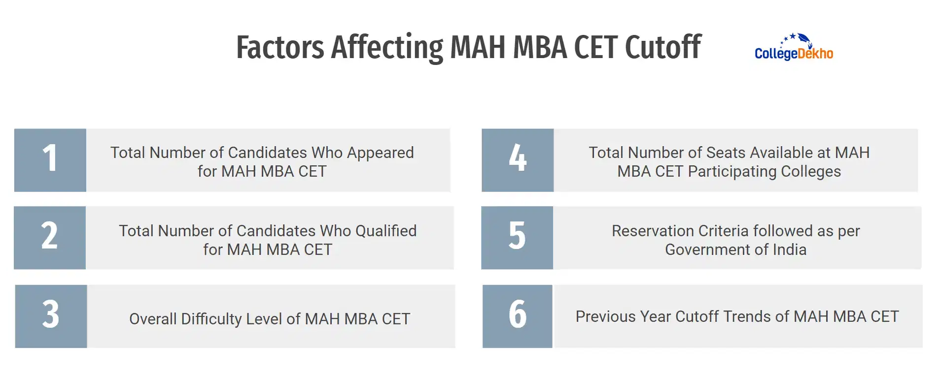 एग्जाम का कठिनाई स्तर: यदि वर्तमान शैक्षणिक वर्ष में एग्जाम का कठिनाई स्तर अधिक है, तो एमएएच एमबीए सीईटी के माध्यम से एमबीए एडमिशन के लिए कटऑफ कम कर दी जाती है।