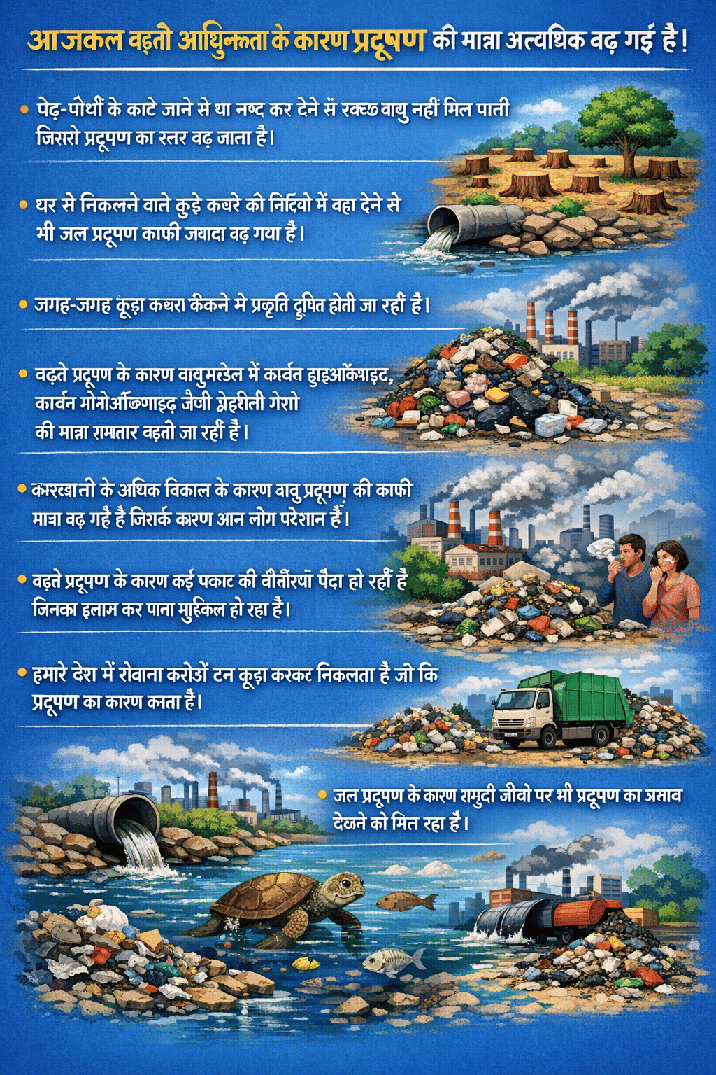 - आजकल बढ़ती आधुनिकता के कारण प्रदूषण की मात्रा अत्यधिक बढ गई है।