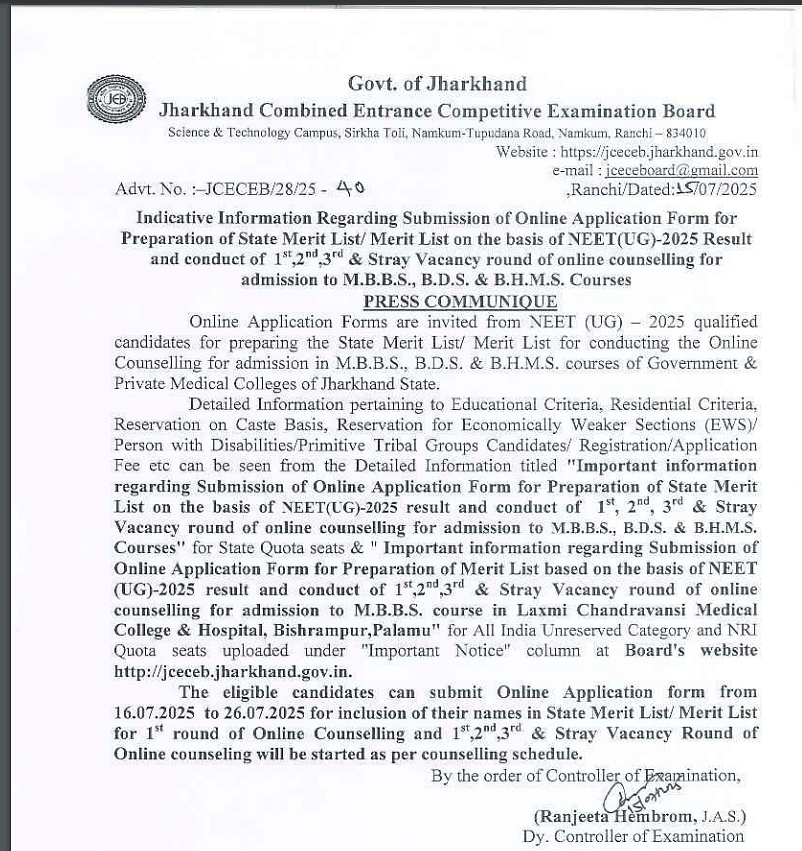 झारखंड नीट MBBS 2025 दस्तावेज़ सत्यापन और एडमिशन | सितंबर, 2025 |