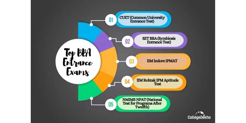 भारत में BBA में एडमिशन के लिए बेस्ट एंट्रेंस एग्जाम में सीयूईटी यूजी, एसईटी BBA, IIM इंदौर आईपीएमएटी, IIM रोहतक IPM एप्टीट्यूड टेस्ट, जेआईपीएमएटी, एआईएमए यूजिएटी, एनएमआईएमएस एनपीएटी और क्राइस्ट यूनिवर्सिटी एंट्रेंस टेस्ट शामिल हैं। उम्मीदवारों को इन एंट्रेंस एग्जाम के लिए उन कॉलेजों के आधार पर आवेदन करना चाहिए जिनमें वे एडमिशन चाहते हैं।