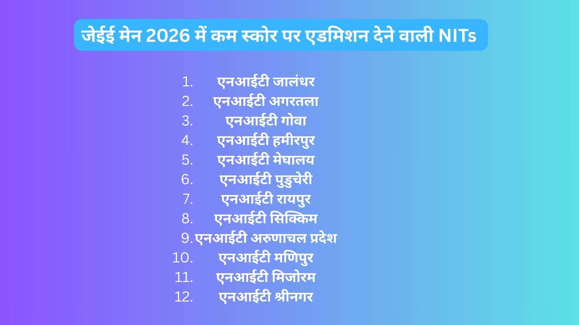 एनआईटी गोवा, एनआईटी मणिपुर, एनआईटी अगरतला, एनआईटी जालंधर, एनआईटी हमीरपुर इंजीनियरिंग, एनआईटी पुडुचेरी, एनआईटी अरुणाचल प्रदेश, एनआईटी दुर्गापुर कुछ ऐसे एनआईटी हैं जो कम कटऑफ स्कोर के साथ जेईई मेन स्कोर स्वीकार करते हैं।