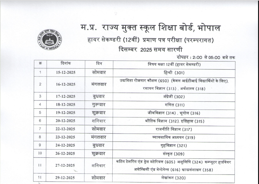 एमपी ओपन स्कूल एग्जाम क्लास 12 टाइम टेबल 2025 (MP Open School Class 12th Exam Time Table 2025 in Hindi): दिसंबर सेशन