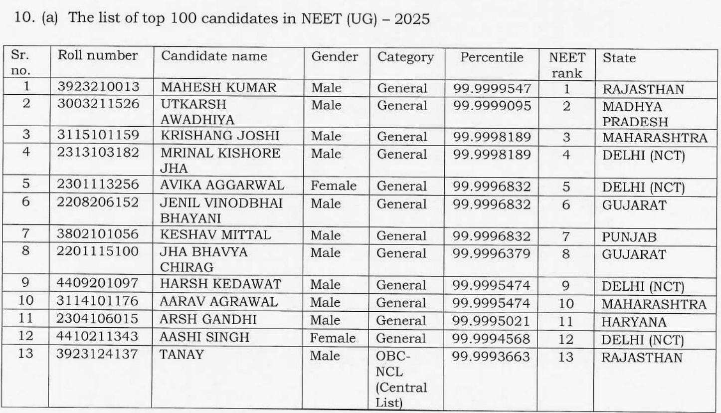 - नीट टॉपर लिस्ट 2025 (NEET Topper List 2025): जारी
