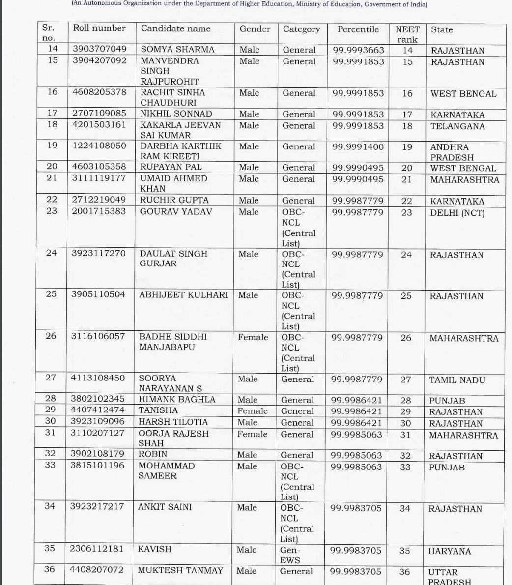 नीट टॉपर्स के नाम | रोल नंबर | पर्सेंटाइल | स्कोर |