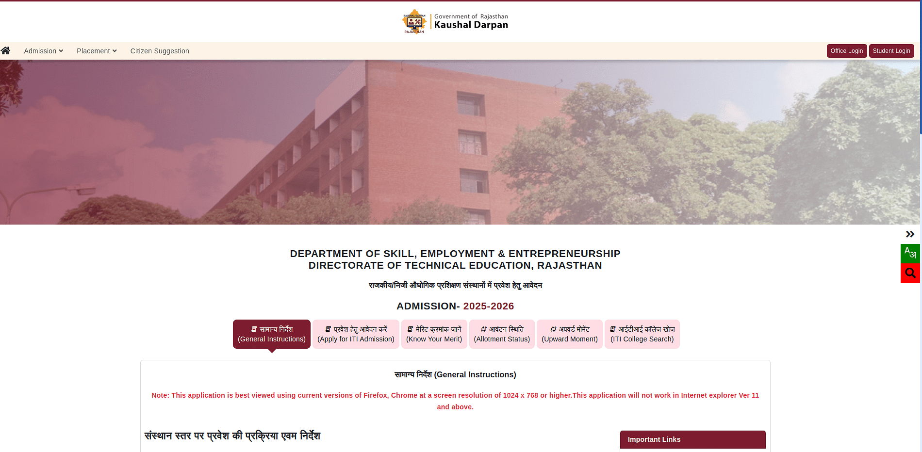 राजस्थान आईटीआई मेरिट लिस्ट 2025 (Rajasthan ITI Merit List 2025) डिपार्टमेंट ऑफ टेक्निकल एजुकेशन (डीटीई), राजस्थान द्वारा वर्ष 2025 के लिए इसकी आधिकारिक वेबसाइट hte.rajasthan.gov.in/ पर 15 जुलाई 2025 को जारी कर दी गयी है। इस लिस्ट में छात्र एडमिशन स्टेटस, ट्रेड, रजिस्ट्रेशन नंबर आदि की जानकारी प्राप्त कर सकते हैं। यदि आप भी राजस्थान के सरकारी आईटीआई से इंडस्ट्रियल स्किल्स सीखकर अपने करियर को बेहतर बनाना चाहते हैं, तो आपको राजस्थान आईटीआई एडमिशन 2025 (Rajasthan ITI Admission 2025) के लिए ऑनलाइन फॉर्म भरना होगा, जिसके लिए रजिस्ट्रेशन प्रक्रिया 10 मई से शुरू कर की गई थी तथा रजिस्ट्रेशन फॉर्म भरने की लास्ट डेट 10 जुलाई 2025 थी। एप्लिकेशन फॉर्म भरने के बाद छात्रों को शॉर्टलिस्ट किया जाएगा, जिसके बाद जुलाई में राजस्थान आईटीआई की आधिकारिक वेबसाइट पर मेरिट लिस्ट जारी कर दी गयी है। रैंक मेरिट जारी होते ही यहां लिंक अपडेट कर दी गयी है। इच्छुक उम्मीदवार यहां से राजस्थान ITI मेरिट लिस्ट 2025 (Rajasthan ITI Merit List 2025) का डायरेक्ट लिंक प्राप्त कर सकते हैं।