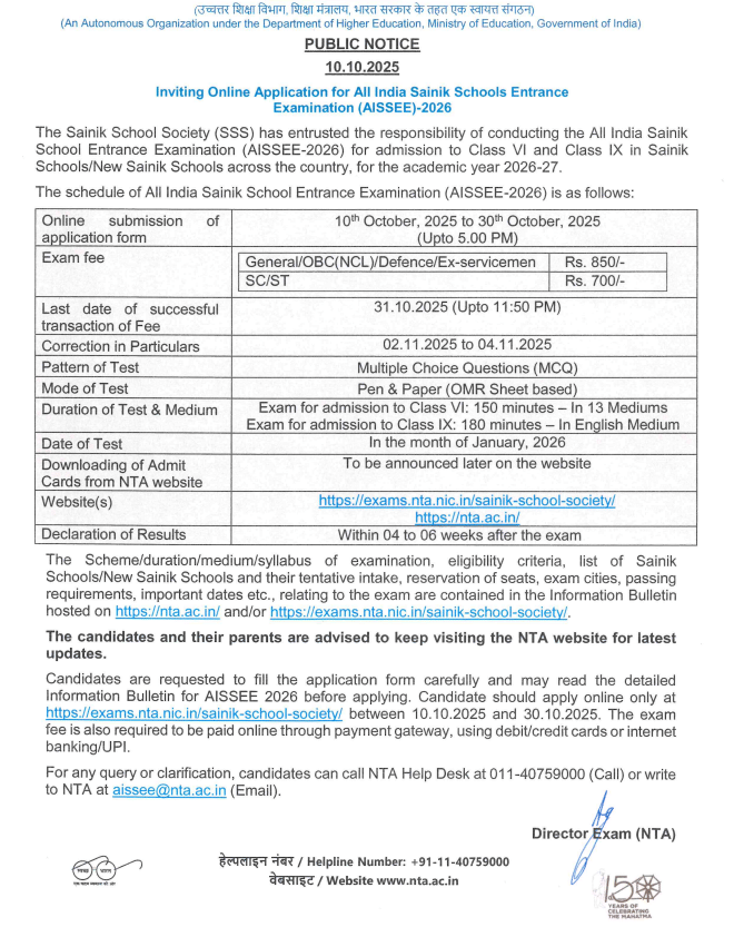 | सैनिक स्कूल एडमिशन ऑनलाइन एप्लीकेशन लास्ट डेट 2026 (Sainik School Admission Online Application 2026 in Hindi) की लास्ट डेट | 30 अक्टूबर, 2025 |