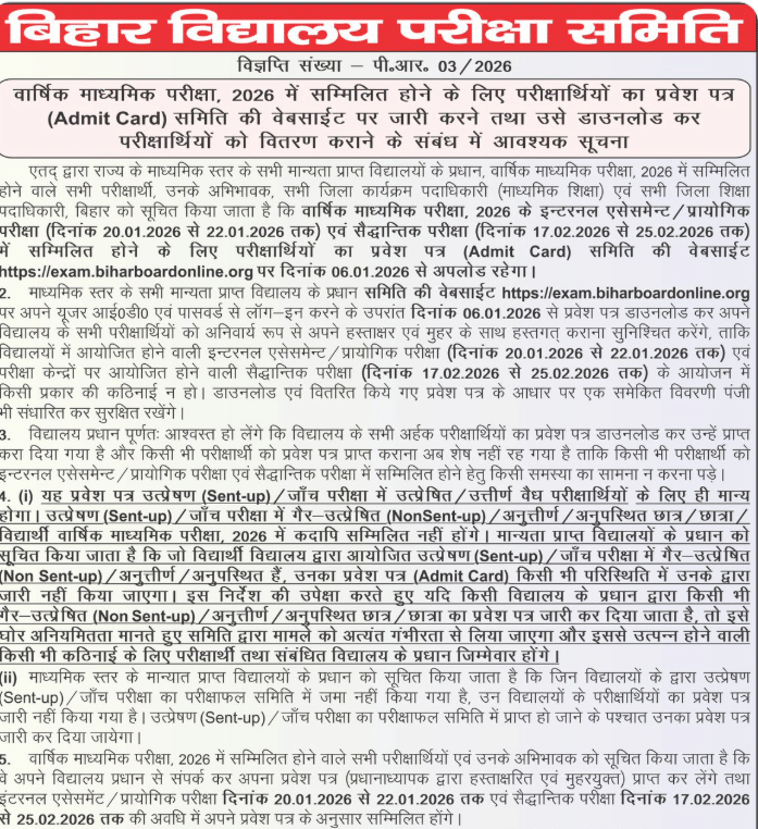- बिहार बोर्ड 10वीं एडमिट कार्ड 2026 (Bihar Board 10th Admit Card 2026 in Hindi) ऑफिसियल वेबसाइट https://exam.biharboardonline.org/ पर 6 जनवरी, 2026 को जारी कर दिया गया है।