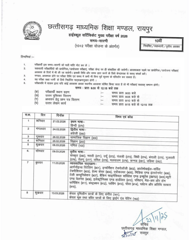 छत्तीसगढ़ बोर्ड 10वीं टाइम टेबल 2026, 21 नंबवर, 2025 को जारी कर दिया गया है।
