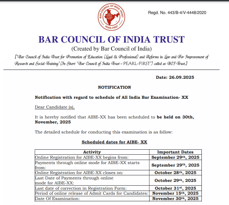 एआईबीई 20 एप्लीकेशन डेट 2025 जारी कर दी गयी है। AIBE 20 रजिस्ट्रेशन डेट 29 सितम्बर 2025 है।