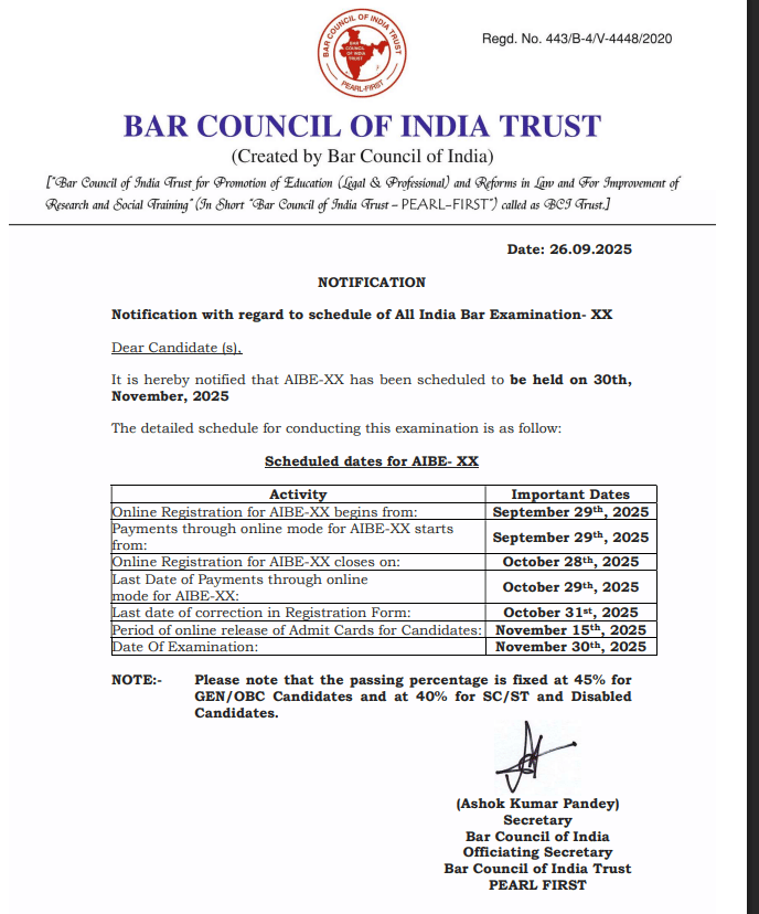 एआईबीई रजिस्ट्रेशन डेट 2025 (AIBE Registration Date 2025 नीचे दी गई है।