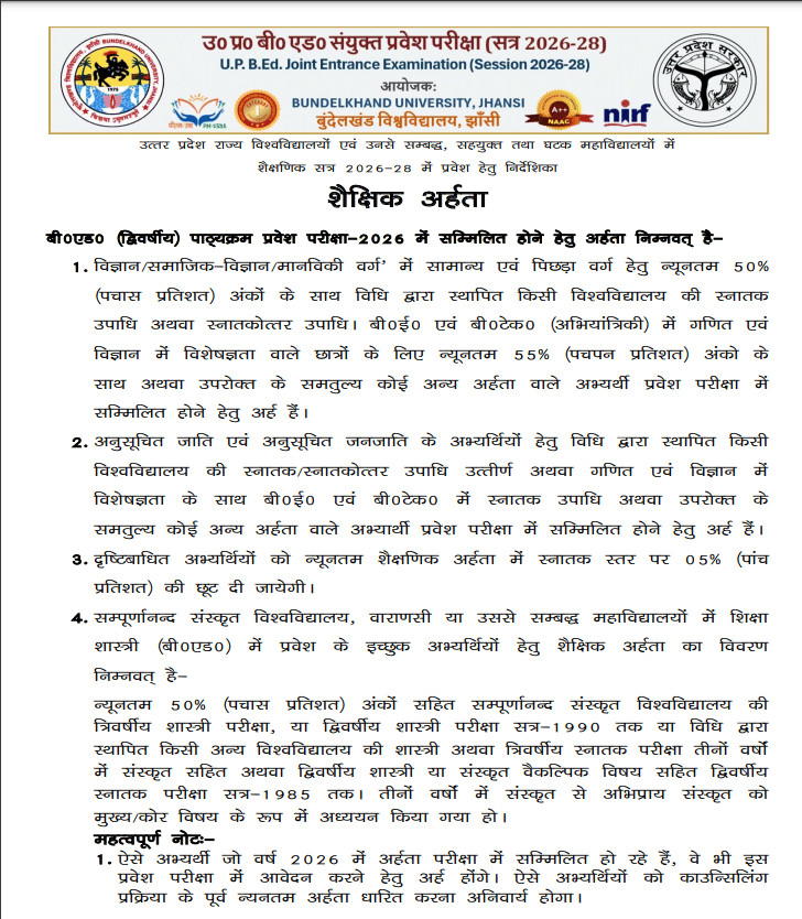 हमने इस सेक्शन में एंट्रेंस के लिए विस्तृत यूपी बी.एड जेईई एलिजिबिलिटी क्राइटेरिया 2026 (UP B.ED JEE Eligibility Criteria 2026 in Hindi) प्रदान किया है। यह ध्यान दिया जाना चाहिए कि यदि उम्मीदवार उल्लिखित यूपी बी.एड जेईई एलिजिबिलिटी क्राइटेरिया 2026 (UP B.ED JEE Eligibility Criteria 2026) को पूरा करने में विफल रहते हैं, तो उनकी उम्मीदवारी रद्द हो सकती है: