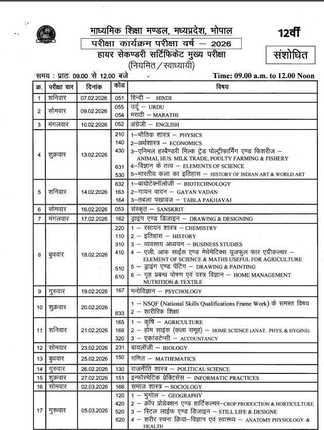 मध्य प्रदेश माध्यमिक शिक्षा बोर्ड (Madhya Pradesh Board of Secondary Education) द्वारा 13 अगस्त 2025 को एमपी बोर्ड 12वीं टाइम टेबल 2026 (MP Board 12th Time Table 2026 in Hindi) जारी किया गया था। MPBSE बोर्ड द्वारा MP बोर्ड 12th टाइम टेबल 2026 PDF को रिवाइज या संशोधित किया गया है। MP बोर्ड क्लास 12 नई डेट शीट 2026 के अनुसार 5 मार्च को होने वाली परीक्षा अब 5 मार्च 2026 को होगी। छात्र एमपीबीएसई की आधिकारिक वेबसाइट mpbse.nic.in पर जाकर मध्य प्रदेश बोर्ड 12वीं परीक्षा टाइम टेबल 2026 पीडीएफ (Madhya Pradesh Board 12th Exam Time Table 2026 pdf) डाउनलोड कर सकते हैं। एमपीबीएसई 12वीं परीक्षा 2026, 7 फरवरी 2026 से 5 मार्च 2026 सुबह 9:00 बजे से 12:00 बजे तक आयोजित की जाएंगी। एमपी बोर्ड कक्षा 12 की प्रैक्टिकल एग्जाम 10 फरवरी से 10 मार्च, 2026 के बीच आयोजित किये जाएंगे। MP बोर्ड क्लास 12 परीक्षा कार्यक्रम के बारे में महत्वपूर्ण जानकारी MP बोर्ड क्लास 12 टाइम टेबल 2026 में उल्लिखित है, जिसका छात्रों को परीक्षा देते समय पालन करना होगा। छात्रों को परीक्षा हॉल में जिन निर्देशों का पालन करना होगा, उनका विवरण भी एमपी बोर्ड 12वीं परीक्षा डेटशीट 2026 (MP Board 12th Exam Date Sheet 2026 in Hindi) में है। नीचे दिए गए लिंक से एमपी बोर्ड कक्षा 12 टाइम टेबल 2026 पीडीएफ डाउनलोड (Mp board class 12 time table 2026 pdf download) करें।
