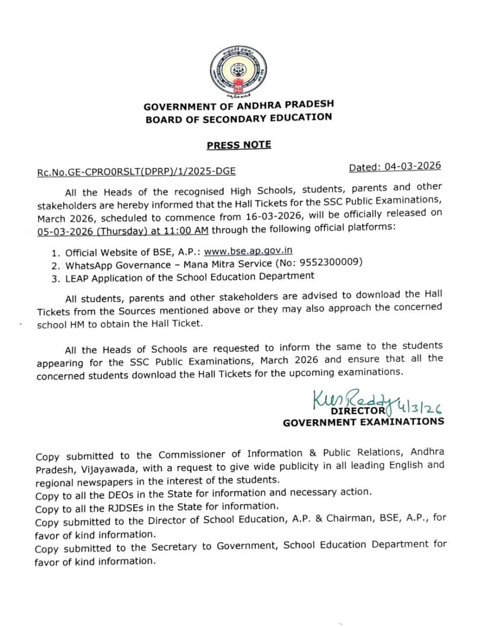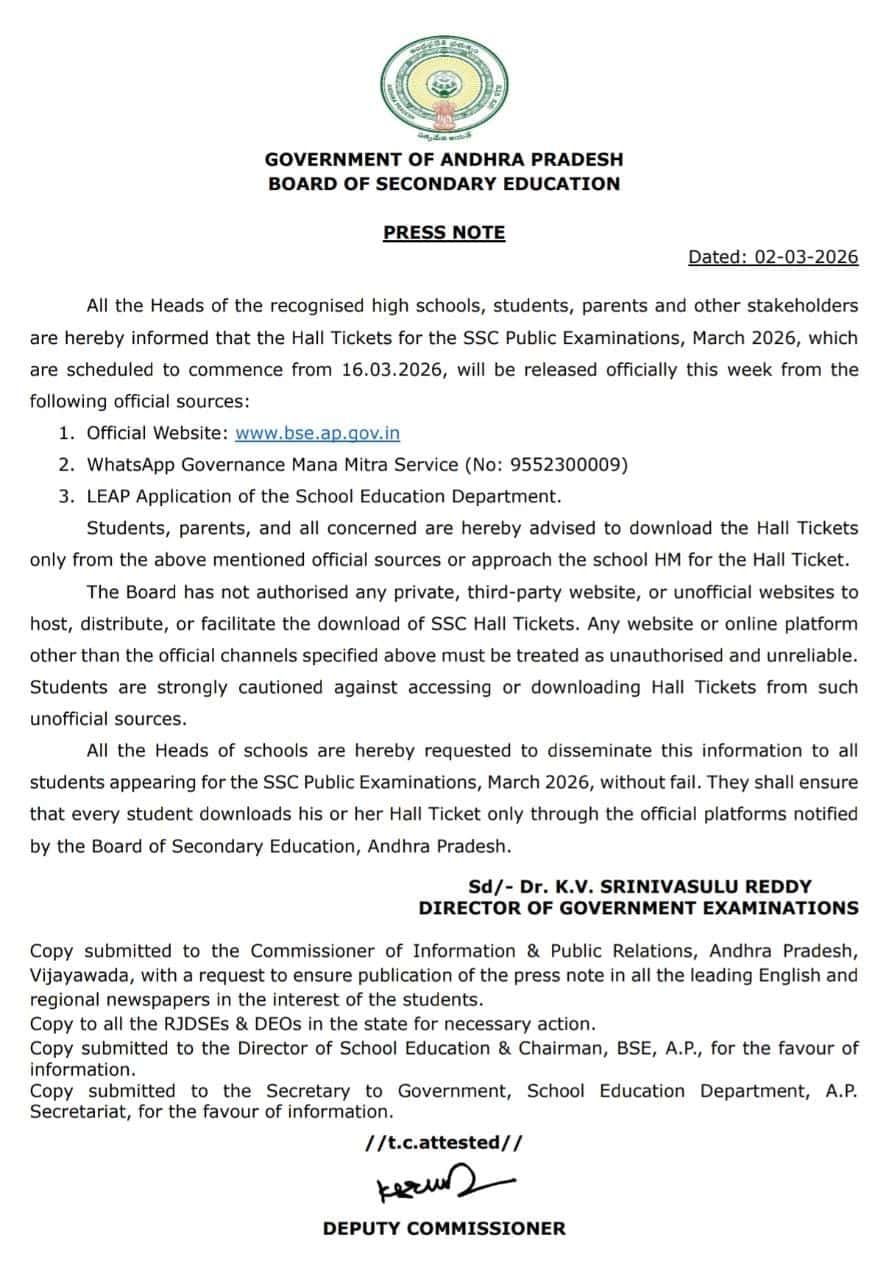 Through its official press note released on March 2, BSEAP has confirmed that it has not made the hall ticket link public yet. It advised students not believe unofficial sources claiming to host the hall ticket. The board advised stduents that only the official BSEAP website, LEAP hall and ManaMitra service shall provide hall ticket download link on March 5.