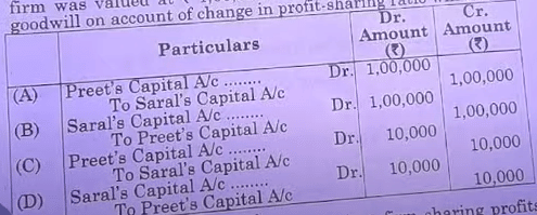 Preet and Saral were partners sharing profits and losses in the ratio of 3: 2. On 31st March, 2024 they decided to change their profit sharing ratio to 1: 1. On the date of reconstitution goodwill of the firm was valued at 1,00,000. The journal entry for treatment of goodwill on account of change in profit-sharing ratio will be :