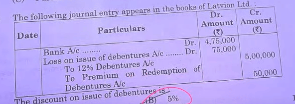16 (b) | Zeba Limited issued 15,000, 9% debentures of 100 each at 10% discount on 1st April, 2023. It has a balance of₹ 1,00,000 in Securities Premium Account. The 'Discount on issue of Debentures' of 1,50,000 will be written off : | (A) ₹1,00,000 out of Securities Premium Account and₹ 50,000 out of Statement of Profit and Loss |
