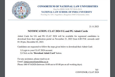 CLAT 2024 Admit Card ReleasedCLAT 2024 Admit Card Released: The Consortium of National Law Universities has released the CLAT Admit Card 2024 today, November 21. Candidates should enter the login credentials such as mobile number and password to download the CLAT admit card pdf. Candidates should carry the CLAT admit card along with the other required documents to the exam hall on the exam day.
