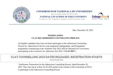 CLAT Counselling 2023: Today, on December 28, 2022, the Consortium of NLUs declared the detailed schedule for all the counselling rounds of CLAT 2023, and the same can be checked here. The counselling process has begun with the registration process today itself, December 22 at 6 PM. The candidates who are deemed eligible for participation in CLAT 2023 counselling have been invited to participate in the admissions counselling process in accordance with the rank list and the admissions matrix provided by each NLU. The same has also been conveyed via their candidate logins and the invite must be ensured through the official website, in case if any email/SMS is not received.
