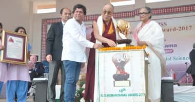The KISS Humanitarian Award 2017 was conferred to His Holiness The 14 th Dalai Lama at KISS (Kalinga Institute of Social Sciences) on November 21, 2017. President of KIIT & KISS, Smt. Saswati Bal and Founder, Professor Achyuta Samanta presented the award in the presence of 27,000 students of the institute and a host of dignitaries.