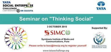 Tata Social Enterprise Challenge (TSEC) – a joint initiative of the Tata Group and Indian Institute of Management Calcutta Innovation Park (IIMCP) in partnership with Symbiosis International University is set to conduct its student seminar series ‘Thinking Social’ at Symbiosis Institute of Media and Communication, (SIMC) PG, Pune. The day-long seminar to be held on 3rd October, 2015 seeks to build awareness, interest and desire to engage with the Social Enterprise Ecosystem amongst the graduate and post-graduate students who are about to embark on their careers soon. The speakers will comprise of eminent entrepreneurs, who have established their own outstanding ventures in the Indian social entrepreneurship space. ‘Thinking Social’ is proud to host an eminent set of speakers hailing from the academia and social entrepreneurial space. The event will shall be inaugurated by Prof. Chandan Chatterjee, Director, SIMC Pune and by Sudipta Marjit, Dy. VP of Tata Capital and other representatives from IIMCP. The seminar provides budding entrepreneurs and students the opportunity to learn from the speakers at the event about their journey, the challenges they faced and impact of their social ventures. Participation requires no fee and will be done on first-confirmed-first-served basis.