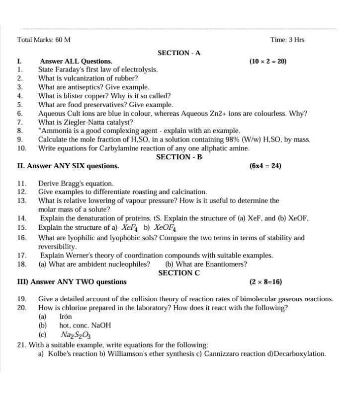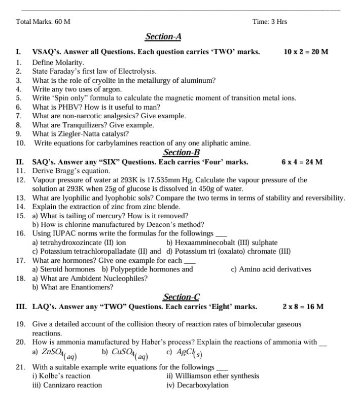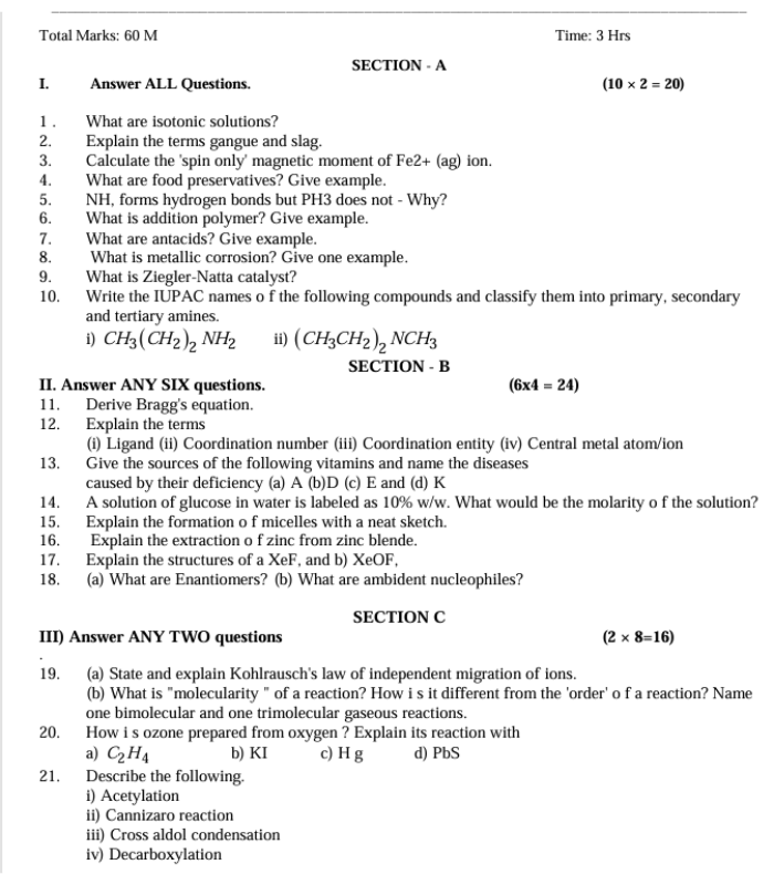 The question paper will be divided into three sections. You can check all details and facts related to TG Inter 2nd Year Chemistry 2026 below: