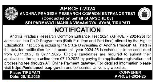 AP RCET 2025 నోటిఫికేషన్ విడుదల (AP RCET 2025 Notification Released) : అక్టోబర్ 3న AP RCET పరీక్ష తేదీ 2025 ప్రకటించిన తర్వాత, APSCHE తరపున తిరుపతిలోని శ్రీ పద్మావతి మహిళా విశ్వవిద్యాలయం, 2024–25 విద్యా సంవత్సరానికి ఆంధ్రప్రదేశ్ రీసెర్చ్ కామన్ ఎంట్రన్స్ టెస్ట్ (AP RCET) నోటిఫికేషన్ను ఈరోజు అక్టోబర్ 6న ఒక పత్రికా ప్రకటన ద్వారా విడుదల చేసింది. అయితే, అధికారిక AP RCET 2025 వెబ్సైట్ ఇంకా ప్రారంభించబడలేదు. నోటిఫికేషన్ ప్రకారం, దరఖాస్తు ప్రక్రియ రేపు అక్టోబర్ 7న ప్రారంభమవుతుంది. అధికారిక పోర్టల్ ఈ రోజు సాయంత్రం నాటికి ప్రత్యక్ష ప్రసారం కానుంది, ఇక్కడ అభ్యర్థులు స్పష్టమైన షెడ్యూల్ మరియు ఇతర ముఖ్యమైన సమాచారాన్ని యాక్సెస్ చేయగలరు.